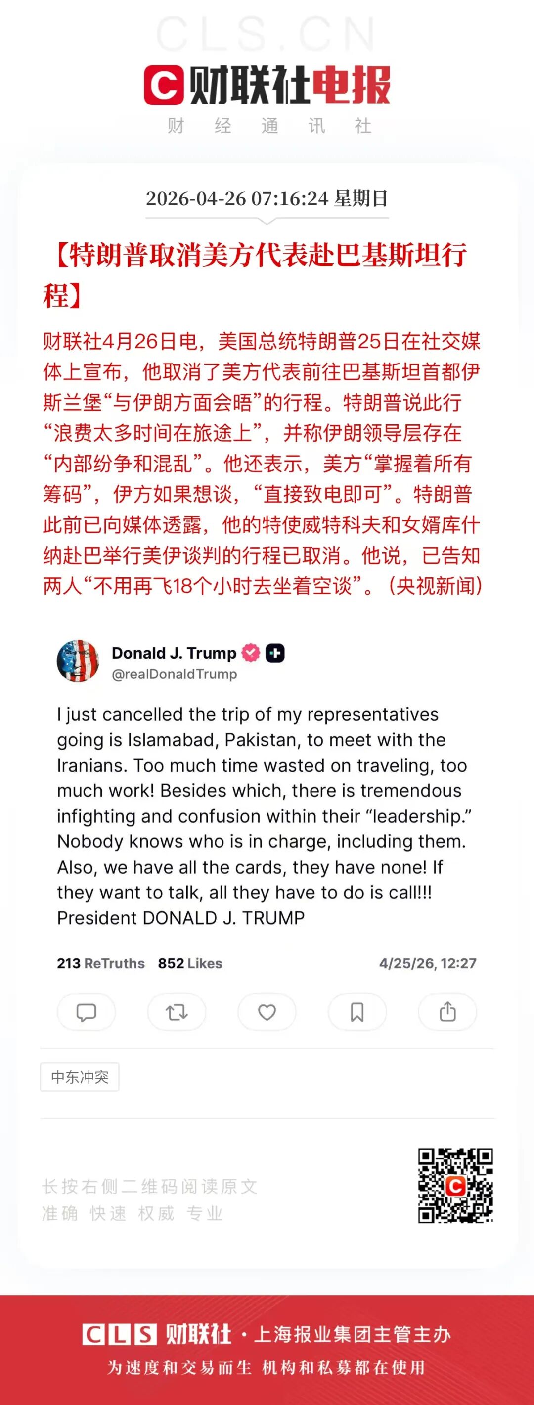 4月24日:伊朗外长阿拉格齐抵达伊斯兰堡,但伊朗方面明确表示,此次访问“并无与美方会谈的安排”,谈判方案将在会晤巴基斯坦领导人后,经由巴方转达给美国。同日,美国白宫却对外证实,总统特使威特科夫和库什纳将于25日启程赴巴,双方行程信息完全不对等。