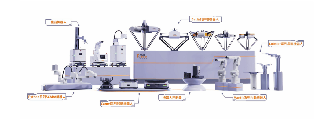 目前,翼菲科技针对中国轻工业应用场景精心设计了工业机器人产品组合,涵盖并联机器人(Bat 系列)、AGV/AMR移动机器人(Camel 系列)、SCARA机器人(Python 系列)、晶圆搬运机器人(Lobster 系列)和六轴工业机器人(Mantis 系列),并具备自主研发的核心技术——控制及视觉系统(Gorilla及Kingkong系列)。