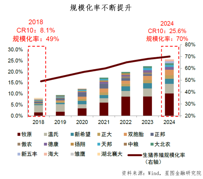 之所以会出现这种变化,我们认为关键在于生猪养殖行业的规模化率持续提升。相比散养户,规模化养殖场在价格研判、成本控制、疫病防控等方面具有明显优势。非洲猪瘟之后,规模化场在丰厚利润的支撑下快速扩张,推动行业规模化率显著提高。据中金公司测算,生猪养殖行业CR10从2018年的8.1%上升至2024年的25.6%;行业规模化率在2018至2024年间提升了21个百分点,达到70%。