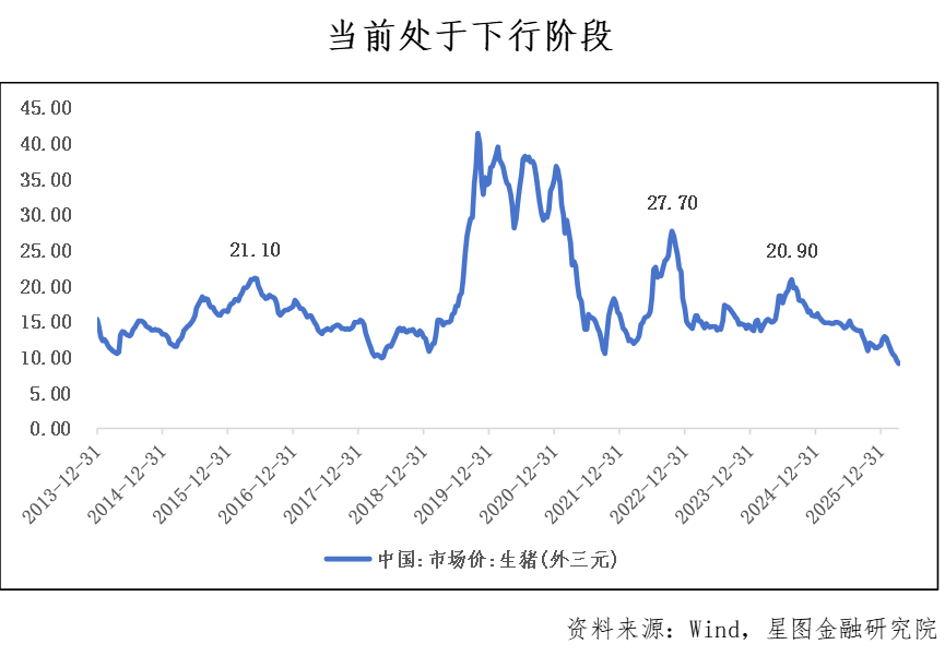 观察生猪(外三元)价格走势:2022年10月曾达到每公斤27.70元的高点,而2024年8月的高点为20.90元。尽管后一个高点低于前一个,但从历史维度看,20.90元/公斤的水平并不算低。作为参照,2016年的周期峰值也不过21.10元/公斤。由此判断,当前应属于2022年以来第二轮猪周期的下行阶段,即2024年高点之后的回落期。