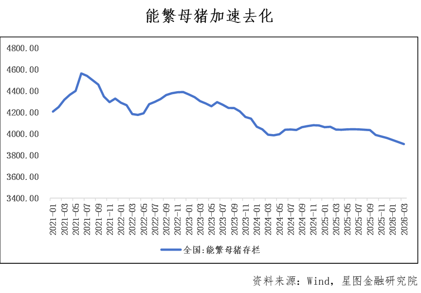 第二,能繁母猪去化加速,供给压力将在下半年逐步缓解。自去年10月起,能繁母猪存栏开始加速下降,仅10-12月三个月内就累计减少74万头。按照生猪10-12个月的生长周期推算,今年8-12月将是供给压力逐步减轻的关键窗口。尤其是在政策引导下,今年能繁母猪去化进一步加快。按计划,年末存栏量将调减至3650万头,月均减少约25.91万头,这一速度是2025年的三倍。截至2026年3月,能繁母猪存栏量已降至3904万头,较2025年底减少57万头。综合来看,年末猪价止跌回升的可能性正在不断加大。