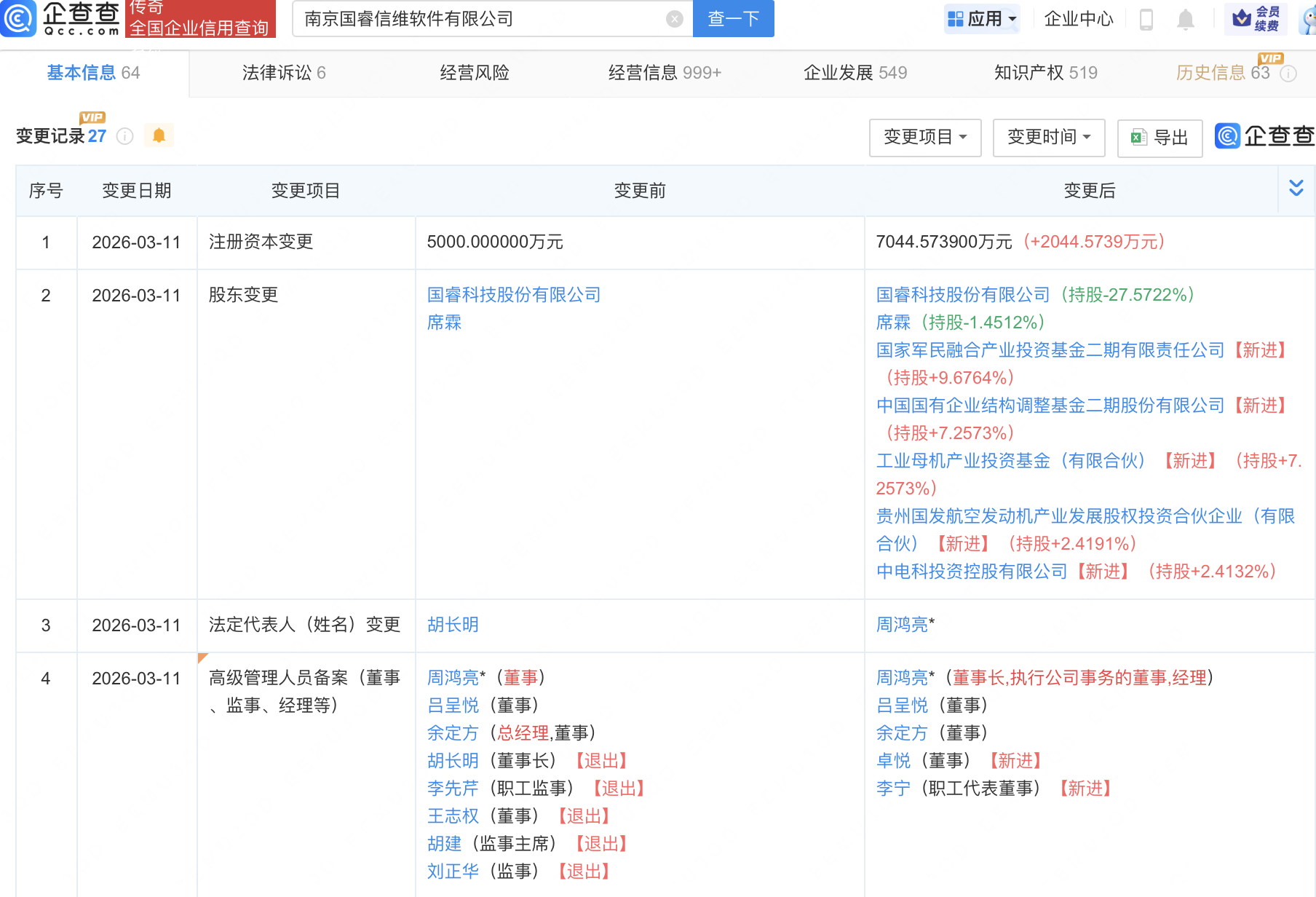 企查查APP显示,近日,南京国睿信维软件有限公司发生工商变更,新增国家军民融合产业投资基金二期有限责任公司、中国国有企业结构调整基金二期股份有限公司、工业母机产业投资基金(有限合伙)等为股东,同时注册资本增至7044.57万元。企查查信息显示,该公司成立于2010年,经营范围包含:人工智能基础软件开发;人工智能基础资源与技术平台;大数据服务;区块链技术相关软件和服务等,由国睿科技(600562)持股67.43%。据其官网,该公司是一家自主工业软件及智造解决方案提供商。