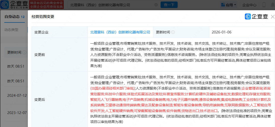 企查查APP显示,近日,北理雷科(西安)创新孵化器有限公司发生工商变更,注册资本从1000万元增加到6000万元,增幅达500%;同时,公司经营范围变更为:智能无人飞行器销售;集成电路销售;卫星移动通信终端销售;雷达及配套设备制造;导航终端销售等。
