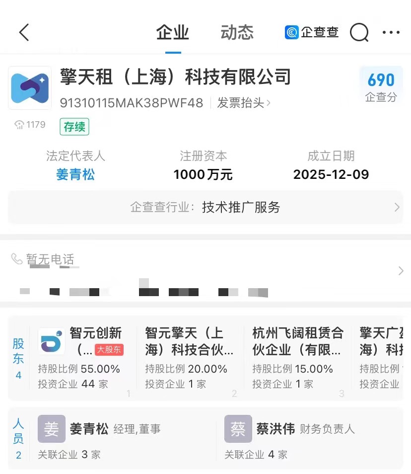 企查查APP显示,近日,擎天租(上海)科技有限公司新增“擎天租”小程序备案。擎天租(上海)科技有限公司成立于2025年12月,法定代表人为姜青松,注册资本1000万元,由智元机器人关联公司智元创新(上海)科技股份有限公司等共同持股。