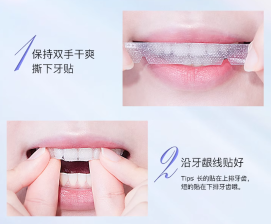 牙贴的使用方法也很简单,先取出牙贴,把牙贴沿牙龈线贴好,长的贴在上排牙齿,短的贴在下排牙齿,约30分钟后撕下牙贴并漱口或刷牙。部分品牌宣称使用1-4周,牙黄色素就能明显减少,还有品牌宣称3天就能看到明显的美白效果。