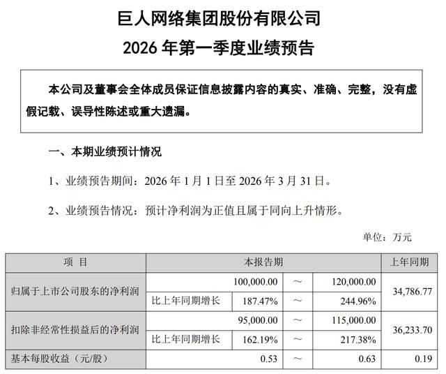 在《超自然行动组》与传统业务板块的双重加持下,巨人网络业绩表现亮眼。步入2026年,公司业绩延续高速增长态势。业绩预告显示,预计一季度归母净利润为10亿元至12亿元,同比增长187.47%至244.96%;扣非净利润预计达9.5亿元至11.5亿元,同比增长162.19%至217.38%。