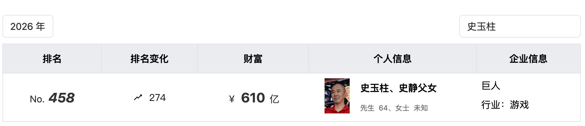 股价的大幅上涨,也让巨人网络实际控制人史玉柱的个人财富水涨船高。通过股权穿透测算,史玉柱合计持有巨人网络37.49%的股份,按最新收盘价计算,其持股市值约229亿元。根据胡润研究院发布的2026年全球富豪榜单,史玉柱、史静父女以610亿元身家位列全球第458位,排名较上年上升274位。