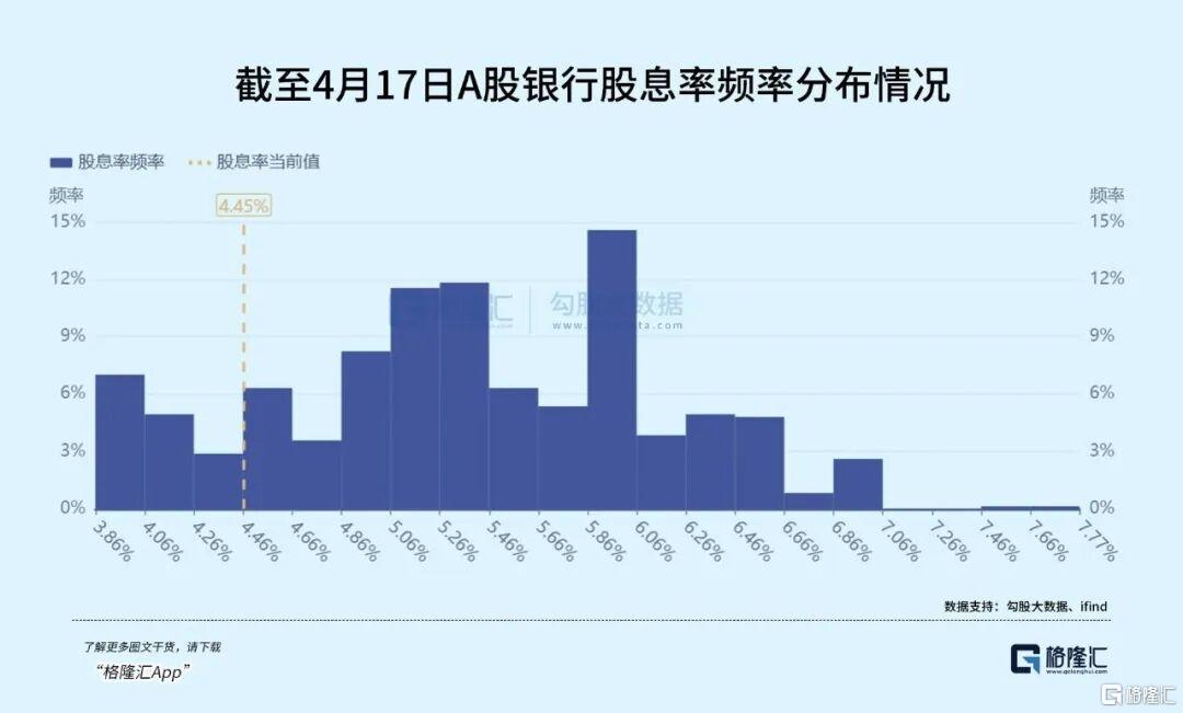 当前10年期国债收益率约为1.8%,银行定期存款及理财产品收益率普遍在2%-3%之间。相比之下,截至2026年4月,A股上市银行中超过90%的TTM股息率超过4%(整体为4.45%),15家以上突破5%。国有大行A股股息率普遍在4%以上,H股更是超过5%。