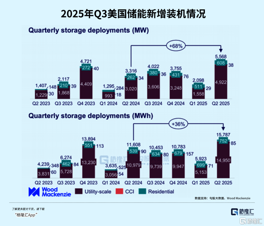 海外市场,是这轮储能增长的核心引擎,尤其是美国市场,正在上演一场缺电危机下的储能狂欢。据伍德麦肯兹数据,2025年Q3美国新增储能装机5.3GW/14.5GWh,全年新增储能装机预计19GW/52.5GWh,功率、容量分别同比+53%/+45%。