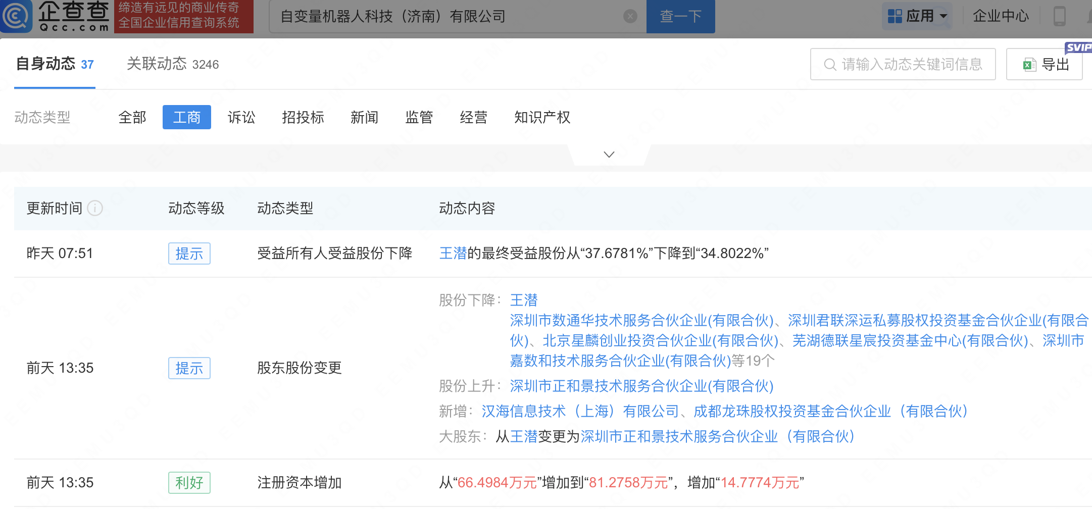 企查查APP显示,近日,自变量机器人科技(济南)有限公司发生工商变更,新增美团关联公司汉海信息技术(上海)有限公司、成都龙珠股权投资基金合伙企业(有限合伙)为股东,同时注册资本增至81.28万元。企查查信息显示,该公司成立于2023年,法定代表人为王潜,经营范围包含:智能机器人的研发;智能机器人销售;人工智能双创服务平台;人工智能公共数据平台等。