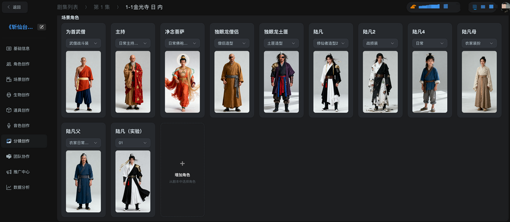 《斩仙台真人 AI 版》是怎么被制作出来的?熊昺辉介绍,AI 技术贯穿了全制作流程,其中最核心的部分是场景与角色生成。AI 会根据剧本内容自动分析场景及其方位,团队则根据需求选取合适的场景方位图,完成包括仙门、寺庙、群山等所有虚拟场景的搭建,AI 还能根据剧情需求调整场景光影、氛围;角色方面,AI 协助生成主角及其他配角的基础人设,同时生成不同场景(比如战斗、哭戏、对话)下的人物形象,确保人设统一。