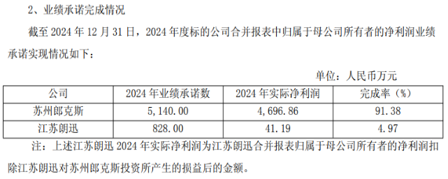 然而从实际完成度看,2024年,苏州郎克斯和江苏朗迅的实际净利润分别为4696.86万元和41.19万元,对应的完成率为91.38%和4.97%,未完成首年的业绩承诺。公司彼时解释称,受新项目前期产品成本较高、毛利率较低等影响,苏州郎克斯该年盈利不及预期;而江苏朗迅由于部分已出货订单未满足收入确认条件等原因导致其收入未达预期。