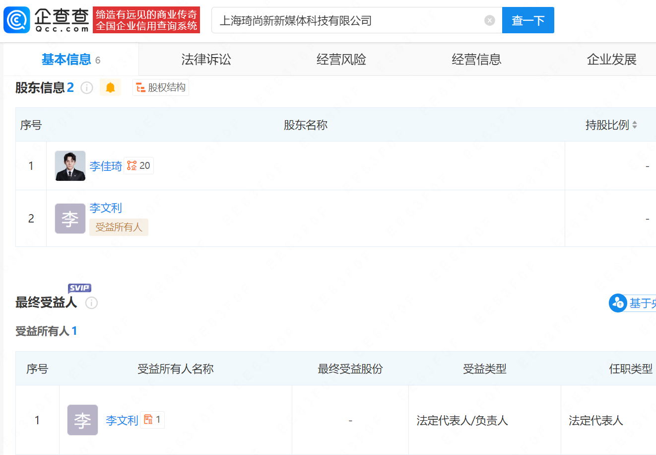 企查查APP显示,近日,上海琦尚新新媒体科技有限公司成立,法定代表人为李佳琦母亲李文利,注册资本100万元,经营范围包含互联网信息服务、电视剧制作、电影发行等,企查查股权穿透显示,该公司由李佳琦和李文利共同持股。