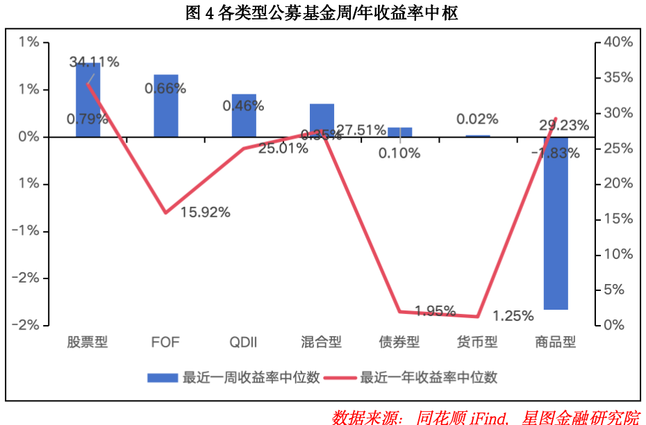 本周基金收益率中枢出现分化,权益、债券市场录得正收益,黄金板块弱势下行。股票型、混合型、QDII型基金收益率中枢分别为0.79%、0.66%、0.46%,较上周分别下行2.92pct、0.64pct、0.05pct,主要因海外纳斯达克、韩国综指、日经指数刷新历史新高,国内创业板指创近11年新高后冲高回落,致使涨幅大幅回撤。商品型基金收益率中枢为-1.83%,较上周大幅下行3.69pct,主要受黄金价格走弱影响。债券型、货币型基金收益率中枢分别为0.10%、0.02%,与上周持平。年度收益率维度,QDII型、FOF型、债券型基金收益率中枢小幅上升,货币型基金收益率中枢保持稳定,其余类型基金年度收益率均有不同程度回落。