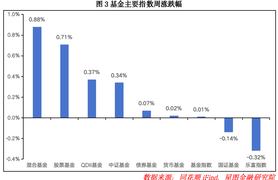 经过连续两周强势反弹后,本周权益市场冲高回落。周内混合型基金、股票型基金、QDII基金分别上涨0.88%、0.71%、0.37%,表现较上周大幅回落;债券型基金本周上涨0.07%,涨幅同样收窄;货币型基金小幅上涨0.02%,表现平稳。周内基金指数表现分化,中证基金指数、基金指数分别上涨0.34%、0.01%,国证基金、乐富指数分别下跌0.14%、0.32%。主要因本周沪市表现优于深市,沪系基金指数显著跑赢深系基金指数。