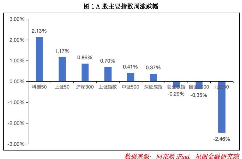 本周A股三大指数周线涨跌不一。其中,上证指数、深证成指、分别累计上涨0.7%和0.37%,创业板指累计下跌0.29%,平均股价累计下跌0.27%,整体赚钱效应一般。