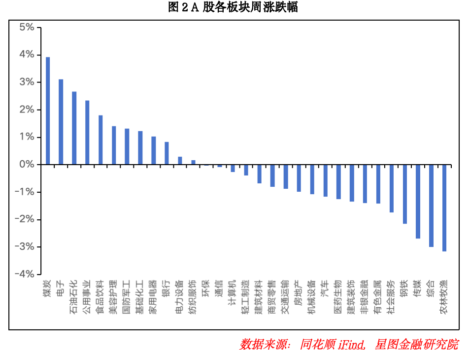 策略前瞻:本周市场整体表现分化,三大指数周线涨跌不一。其中,上证指数、深证成指、分别累计上涨0.7%和0.37%,创业板指累计下跌0.29%,平均股价累计下跌0.27%,整体赚钱效应一般,而本周四周五更是连续两天回调且普跌。板块层面,本周煤炭、电子、石油石化、食品饮料等板块领涨,而农林牧渔、钢铁、传媒、有色等板块累计下跌。