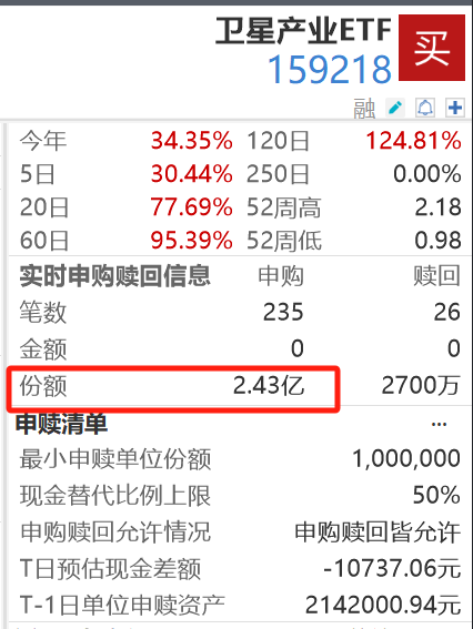 都说不要追高,但卫星这个涨法,资金根本等不到回调,选择“硬上火箭”,卫星产业ETF(159218)午后申购份额已超达到2.43亿,看涨情绪高涨。