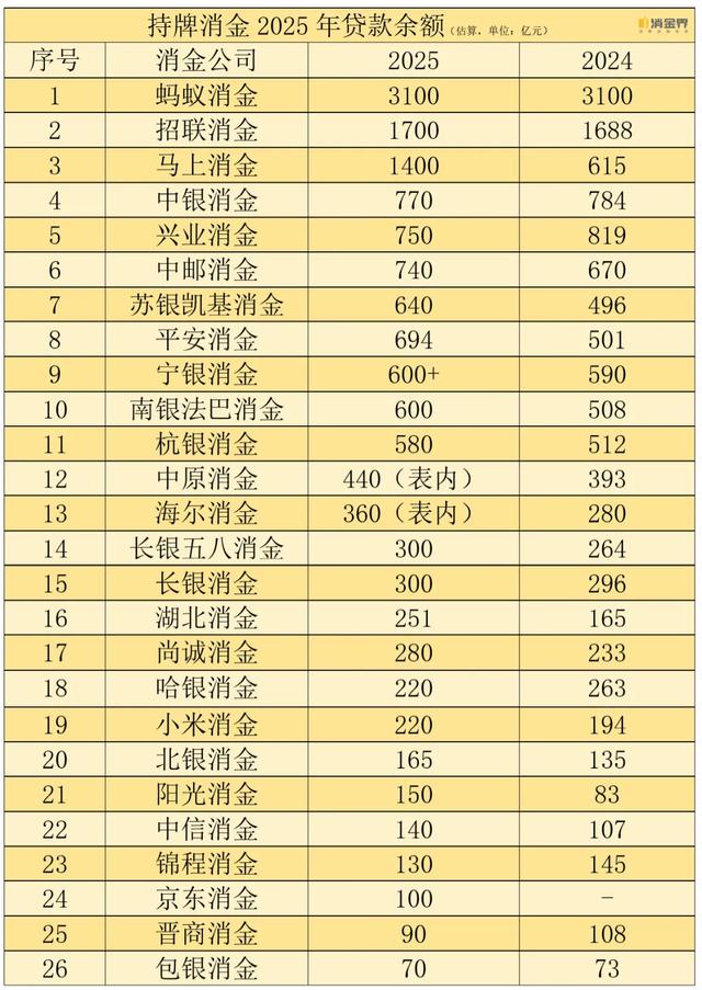 千亿级头部:蚂蚁消金以3100亿元稳居榜首,但规模与2024年持平;招联、马上消费紧随其后。