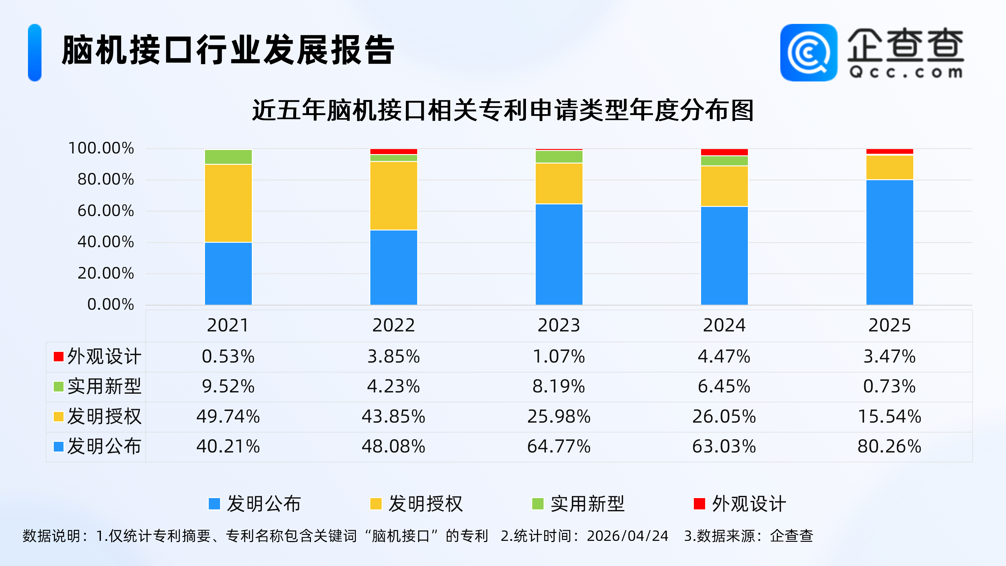 企查查数据显示,截至4月24日,国内现存脑机接口相关专利2280项。存量方面,2016-2025年,国内脑机接口相关专利年末存量从185项增长至2231项。申请量方面,2025年脑机接口相关专利申请量为547项,创近十年新高,同比增长35.7%。专利类型方面,发明专利为绝对主流,其中,发明公布类型申请专利占比从2021年的40.21%提升至2025年的80.26%。