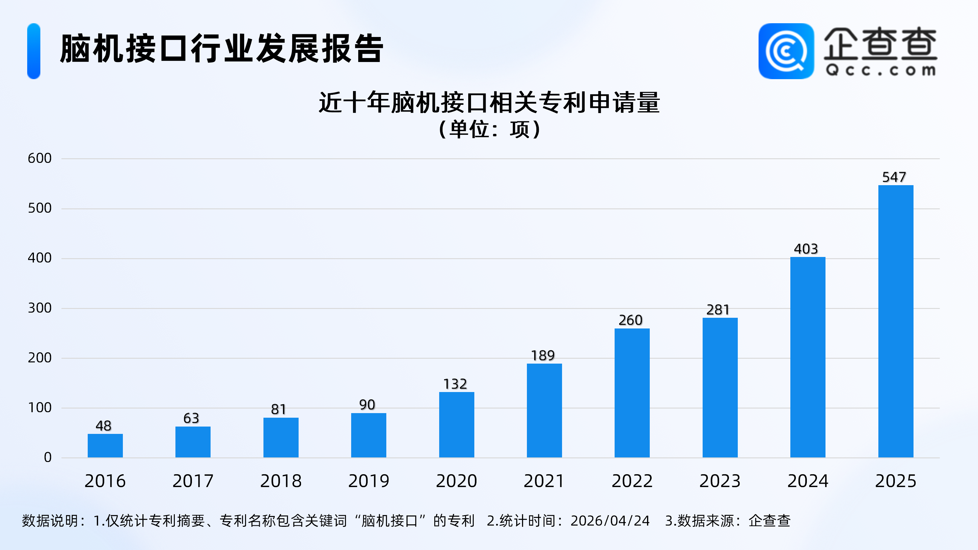 企查查数据显示,2016-2025年,脑机接口相关专利申请量从48项增长至547项,呈现持续增长趋势。2016-2020年为稳步爬坡期,申请量从48项增至132项;2021年起进入快速增长阶段,2021-2025年申请量从189项增至547项,2025年申请量同比增长35.7%,创十年新高。