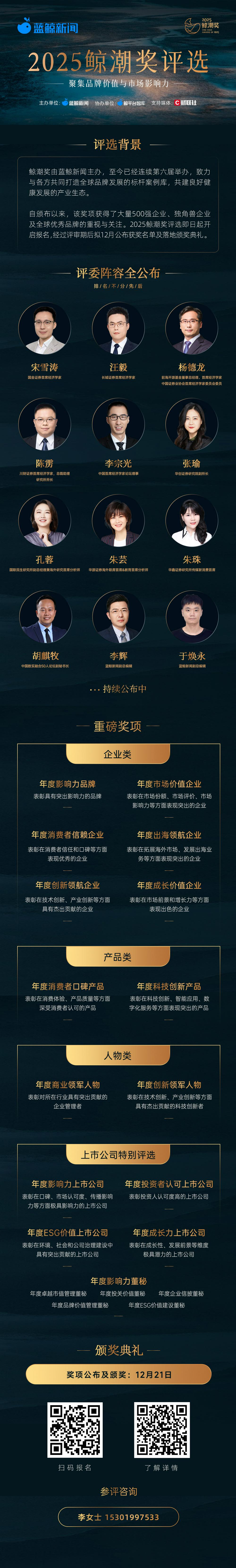 究竟哪些企业品牌能够以创新为帆、以品质为舵,在这个时代锚定发展方向,引领产业未来发展?致敬时代浪潮中的商业力量,聚焦全球优秀品牌,鲸潮奖结合自主申报信息、评委推荐、公开数据,综合品牌影响力、商业价值、创新力等评价维度,评选出相关领域具有突出贡献的企业、机构及个人,打造品牌全球发展的标杆案例,助力品牌全球发展。