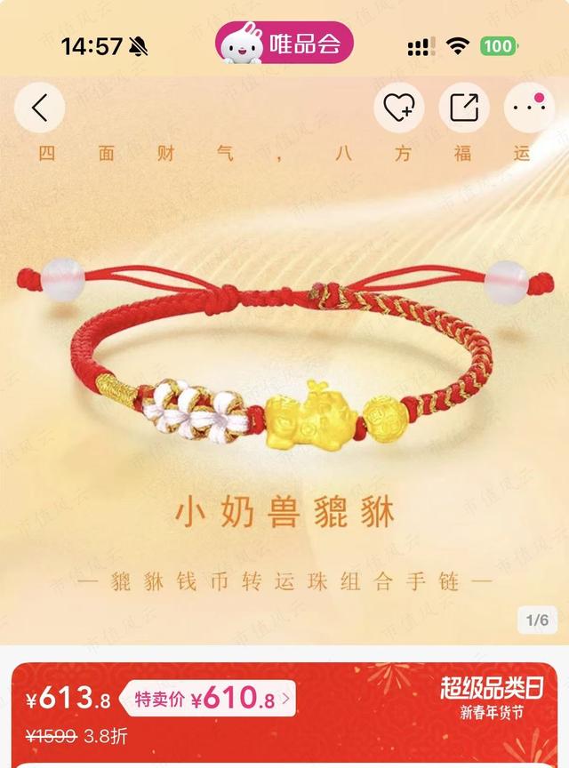 比如黄金,作为春节期间绝对的“硬通货”,周大福、周生生这些大牌在商场里价格坚挺,但在唯品会的特卖频道,往往能蹲到惊喜价。几百块的小金豆、转运珠,配上红绳一戴,既有“情比金坚”的寓意,又有实打实的保值属性,送长辈、送女友绝对不出错。