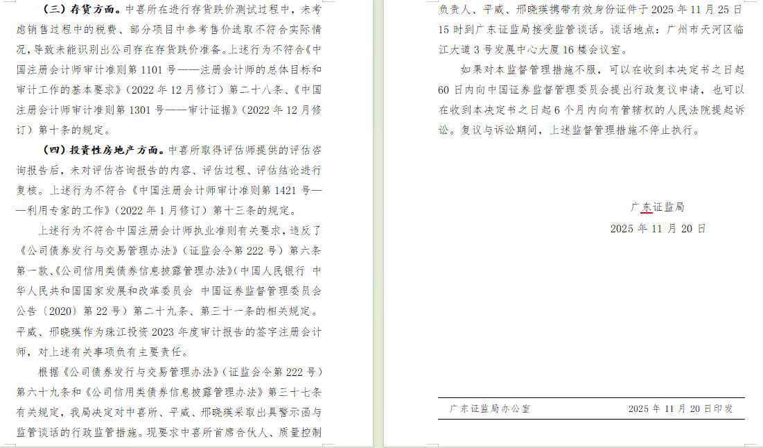 该决定指出,中喜会计师事务所(特殊普通合伙)在广东珠江投资股份有限公司(以下简称珠江投资)2023年财务报表审计项目中,存在以下问题: