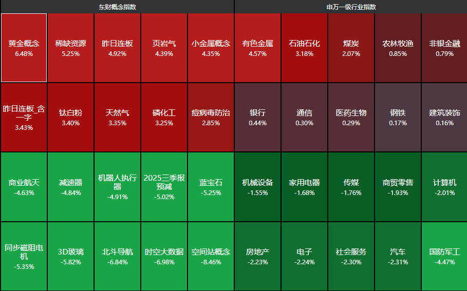分行业来看,有色金属、石油石化、煤炭、农林牧渔、非银金融等行业领涨,国防军工、汽车、社会服务、电子、房地产等行业领跌。