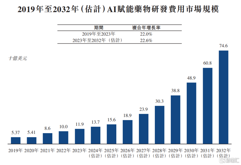 市场层面而言,弗若斯特沙利文数据预计,全球AI赋能药物研发费用市场规模将由2023年的119亿美元增加至2032年的746亿美元,复合年增长率为22.6%,市场空间持续拓宽。