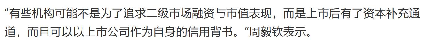 资深金融监管政策专家周毅钦表示,“有些机构可能不是为了追求二级市场融资与市值表现,而是上市后有了资本补充通道,而且可以以上市公司作为自身的信用背书。”