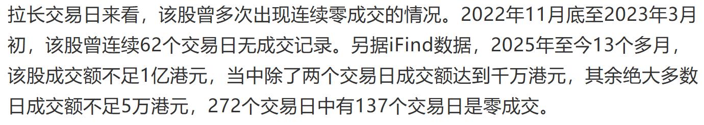 这场单日市值蒸发41亿港元的暴跌,背后仅伴随着114万港元的成交额,相当于每1港元的成交额就引发了近3600港元的市值蒸发,这种杠杆效应在正常流动性的股票中几乎不可能出现。