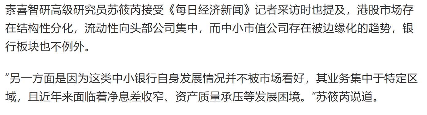 素喜智研高级研究员苏筱芮指出,“港股市场存在结构性分化,流动性向头部公司集中,而中小市值公司存在被边缘化的趋势,银行板块也不例外。”这种分化使得除大型银行和股份行外的多家中小银行都面临长期交易低迷的“窘境”。