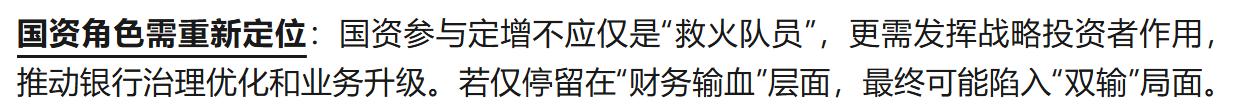 国资角色定位面临重新审视,需从“救火队员”向战略投资者转变。据《视界观事》报道,国资参与定增不应仅是“救火队员”,更需发挥战略投资者作用,推动银行治理优化和业务升级。