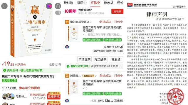 不过,拼多多的上述举措尚未完全扭转平台生态,其内部仍存在大量白牌、未获授权商品。2025年9月,法律实务类图书《赢在二审与再审》作者张绍明就曾公开发文,称其作品在拼多多上遭到大规模盗版销售。