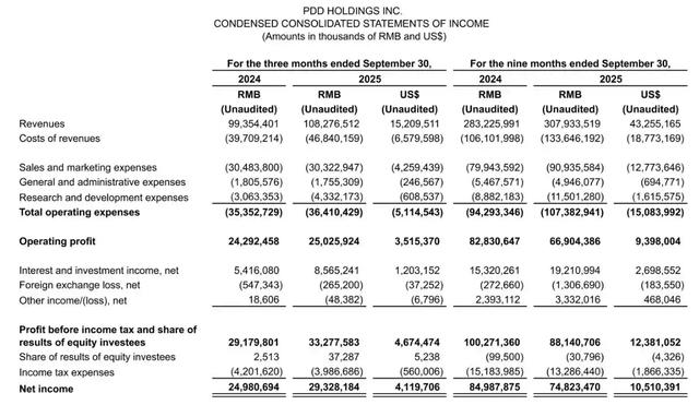 盈利方面,拼多多的增长动能亦稍显不足。2025年三季度,该公司的营业利润为250.26亿元,同比仅微增3.0%;非通用会计准则(Non-GAAP)下的经调整净利润313.82亿元,增幅约为14.3%,增速同样呈现下滑态势。