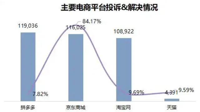 而淘宝、天猫、京东、拼多多等四大主流电商平台中,尤以拼多多的投诉总量尤为突出,为11.90万件。与之形成强烈对比的是,拼多多的平均投诉解决率仅7.82%,位列四大平台最末尾。