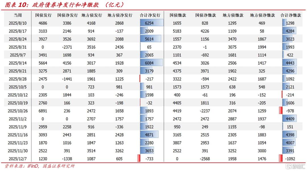 下周政府债券净发行、净缴款转负。本周国债净发行391亿元,地方债净发行3262亿元,政府债合计净发行3653亿元,净缴款合计3391亿元。下周预计国债净发行-1338亿元,地方债净发行605亿元,政府债净融资-733亿元,净缴款合计-1092亿元。