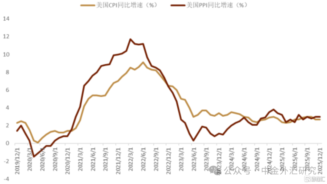 美国通胀上升压力再现 1月公布的数据显示,美国12月核心CPI同比增长2.6%,和前值持平,整体CPI同比增长2.7%,同样持平于市场预期和前值,这也使得这一通胀数据在过去的一年内基本维持稳定。尤其值得注意的是,PPI数据则显示通胀明显有所抬升:美国12月PPI同比上涨3%,明显高于市场的预期2.8%,12月核心PPI同比上涨3.3%,同样高于市场预期的2.9%,12月PPI环比录得0.5%,高于市场预期的0.2%,核心PPI环比录得0.7%,大幅高于市场预期的0.2%,以及前值的0%(图表13)。12月PPI环比增速更是创最近三个月来的最大涨幅,核心指标同比增速也是上升至年内高位附近。分项来看,服务成本显著上升,其中贸易利润率环比涨幅为2024年年中以来的最高水平;核心商品价格也依旧呈加速上涨的态势。整体看,通胀近期的走高也带动了市场对美联储今年降息预期的下行。
