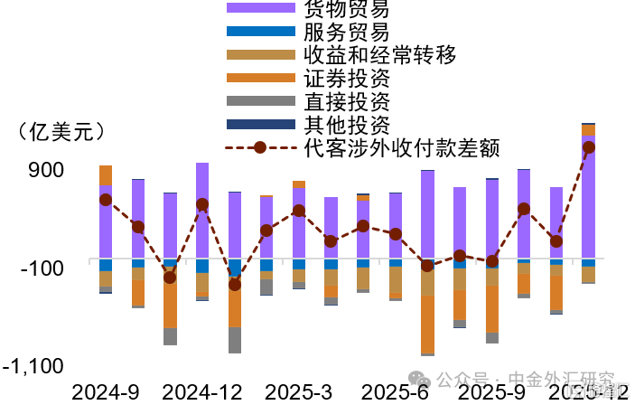 12月银行代客结售汇差额升至999亿美元,为历史新高水平,我们认为背后或体现了出口强韧、结汇意愿抬升及外资偏好境内股市等多重因素共振(详情参考《美元持续展现出韧性》)。具体来看,代客结售汇方面,12月银行代客净结汇999.3亿美元,较上月环比增加835亿美元,处于历史最高的单月水平(图表8)。净结汇的增加主要是货物贸易与证券投资净结汇的贡献,分别环比增加754.2和112.8亿美元。其中货物贸易、服务贸易和证券投资的12月结汇规模均刷新历史高点。12月结汇率升至68.8%,高于年内均值的62.2%,购汇率则降至61%,略低于年内均值的64.7%(图表9)。代客涉外收付款方面,12月差额录得1134.8亿美元,环比增加956.9亿美元,主要源于证券投资(环比+454.1亿美元)与货物贸易(环比+956.9亿美元)差额的明显增加。与结售汇结构不同的是,代客涉外收付款主要依靠货物贸易(+1259.2亿美元)支撑,证券投资环比改善明显,不过绝对水平有限(图表10)。
