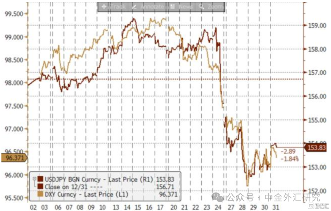 日美联合汇率检查,日元升值至153关口 1月23日(周五)日本央行召开议息会议并在当天北京时间14:30-15:30期间举办了记者招待会,植田行长发言内容边际偏鸽,受此影响日元小幅贬值,美日汇率一度上行至159.23附近。此后在北京时间15:30左右,日元发生了明显升值,美日汇率由159.23一度快速下行至157.37,日元在几分钟内一度升值约1.2%(图表24)。《日本经济新闻》报导称[11] 市场猜测日本当局可能采取了汇率干预的前期步骤——"汇率检查",进而引发了日元买入的操作。此后,记者对日本财务大臣片山询问日本当局是否实施了汇率检查,片山表示[12] “对此不做出评论”。我们认为此举非常符合日本当局过去的惯例,并不会明确同市场交流具体的外汇操作,而是让市场产生怀疑与猜测,进而可以更加有效地牵制汇率的过度波动。1月24日(周六)北京时间凌晨0点至5点期间,日元继续发生升值,美日汇率由158附近下行至156附近(图表24)。伦敦的一位金融中介机构人士透露美联储在美国财政部的指示下正在进行汇率检查,多家金融机构也予以确认[13] 。本次日美联合汇率检查,日元贬值得到修正,截至1月30日日美汇率153日元区间后半。