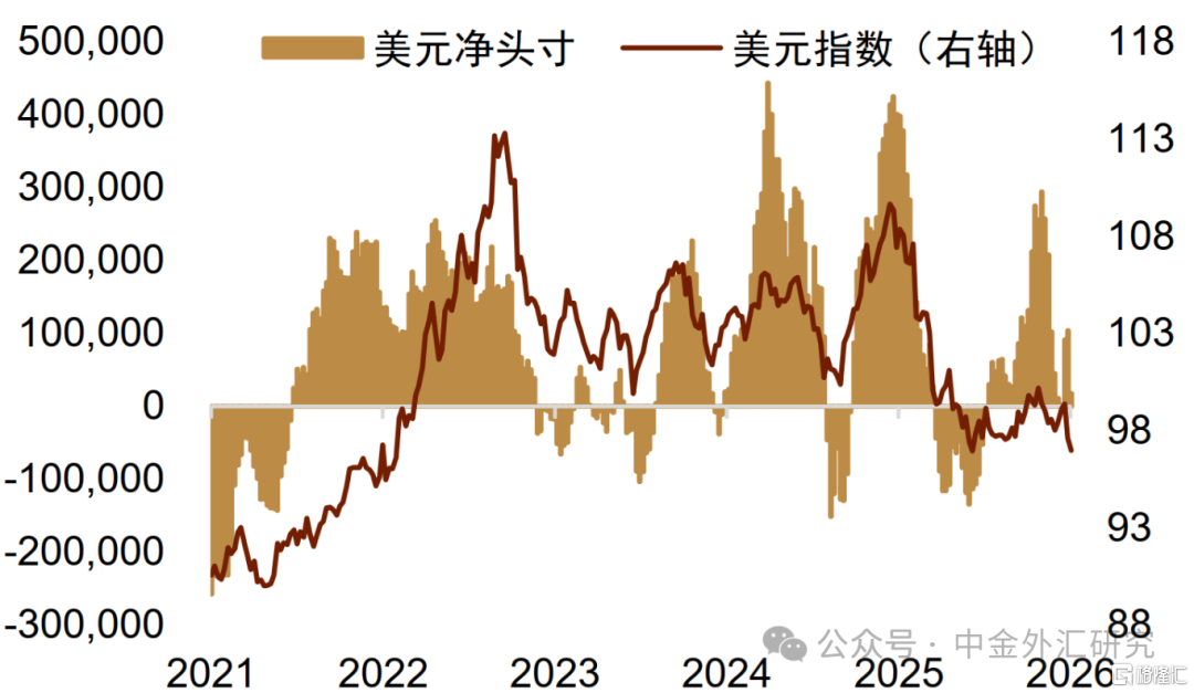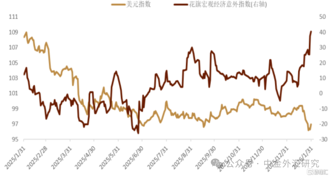 而上周五,特朗普宣布将提名凯文·沃什担任下届美联储主席[8] ,接替5月任期届满的现任主席鲍威尔。沃什长期以鹰派立场著称,尽管自去年以来公开支持降息以迎合特朗普,但市场仍认为其不太可能激进降息,尤其相较于哈塞特等其他人选更为鹰派。而考虑到沃什曾经在美联储任职期间一贯对通胀保持警惕,并且经常支持更高利率。市场对此做出明显鹰派解读,美元也在最近两个交易日出现反弹。向前看,我们认为美联储主席人选的落地可能会对美元产生一定支撑,而1月月内美元下跌的最大推手:特朗普对外政策的不确定性也被市场有所定价,这可能意味着美元在2月可能会有所企稳。