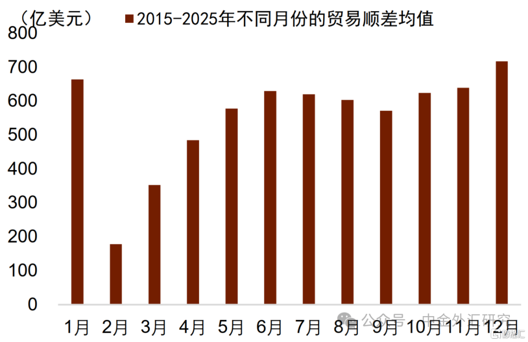 1月外汇市场或继续保持较大的净结汇规模,不过我们认为2月春节后的净结汇规模或有下滑,并影响汇率的强势表现。具体来看,考虑到2026年春节假期位于2月,我们认为企业在1月尚处于春节前正常生产的状态,而且从往年的趋势来看,贸易顺差在1月往往也处于年内较高的水平(图表11)。因此,我们认为2026年1月的贸易顺差有望保持在相对较高的水平。此外,我们认为或是由于美元的下跌及人民币汇率升值的步伐稳健,彭博亦报道[3] 交易员反馈本月客盘结汇力道保持了上月以来的强劲势头。我们认为无论是基于出口表现,抑或是市场的结汇意愿,1月外汇市场或继续保持较大的净结汇规模。不过进入2月,随着季节性因素的降低,以及美元趋于企稳的可能,均可能使得人民币结汇需求走向降温,并对汇率的支撑有所减弱。