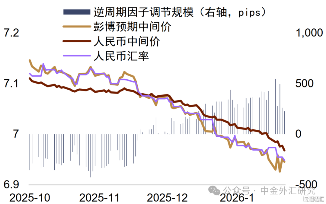 随着人民币汇率在近几个月展现出较强的升值动能,中间价的升值速率也有所抬升,并更加靠拢即期汇率的水平。进入1月,人民币汇率在美元一度反弹的环境下依旧展现出了较强的升值动能,这带动中间价与即期汇率的差距保持在近年来的较高水平(图表6)。从逆周期因子的角度观察,在1月中上旬,逆周期因子整体保持了较高的调节规模,带动中间价整体弱于市场所预期的水平。我们认为,这或体现出在人民币汇率升值预期与动能较强的环境下,中间价一方面随行就市,顺应人民币汇率升值的趋势,另一方面或希望适度引导汇率升值速率,避免短期内的羊群效应。不过进入1月下旬,随着美元的明显走弱,中间价的升值亦有加速趋势,例如1月28日环比走强103点,为一年来最大的单日升值幅度。逆周期因子调节规模亦在1月底收窄至226点,为2026年以来的最低值(图表7),我们认为中间价或在向即期汇率所靠拢。考虑到目前中间价与即期汇率之间仍有较大水平的偏离,我们认为即使短期内即期汇率升值动能有所减退,中间价仍有一定的升值空间,以实现“三价合一”。
