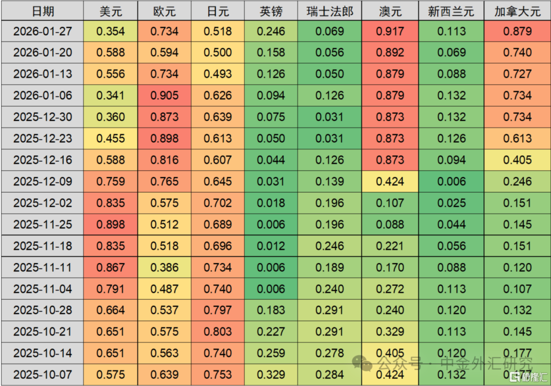 ► 2026年1月美元在99.50附近遇阻之后明显下行,一度跌至年内新低95.5附近。但最近一周出现了小幅反弹行情,美元多头最终收复了去年年内低点附近的关键支撑并且收盘于97附近。一方面,1月公布的美国经济数据依旧展示出一定韧性,而1月FOMC会议也更偏鹰派,市场对美联储的降息预期小幅下降,这限制了美元的下行;另一方面,特朗普政府政策的不确定性,以及市场1月月内对美联储独立性的担忧使得美元出现了大幅的下行。而其他G10非美货币,尤其是纽约联储就日元询价之后日元汇率的大涨一度加速了美元月内的大幅下行。截止1月31日收盘,美元指数最终收跌1.35%左右。。