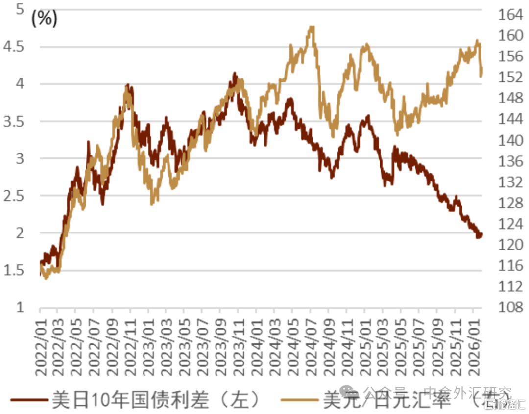 1月日美联合汇率检查带来日元升值 1月初美日汇率始于156附近,此后在高市早苗解散众议院的消息被报导后市场担心财政扩张政策带来日元贬值,因此美日汇率一度上行至159以上,此后在158-159附近波动,此后1月23-24日期间日本与美国分别实施“汇率检查(Rate Check)”,美日汇率受此影响下行至153-155附近(图表21),最终美日汇率在1月末收盘于154.77。1月期间,日元相较美元升值约0.59%,在G10货币中排名居中,在亚洲货币中排名靠前。息差方面,美日息差继续收窄,日元终于小幅升值,可以向息差方向稍微靠拢,但是该“靠拢”更多是“汇率检查”所致而非息差逻辑(图表22)。日元期货头寸角度来看,截至1月27日,芝商所外汇期货市场中对冲基金对日元的净空头约在7万张合约附近,并未处于“极值”水平 (图表23)。
