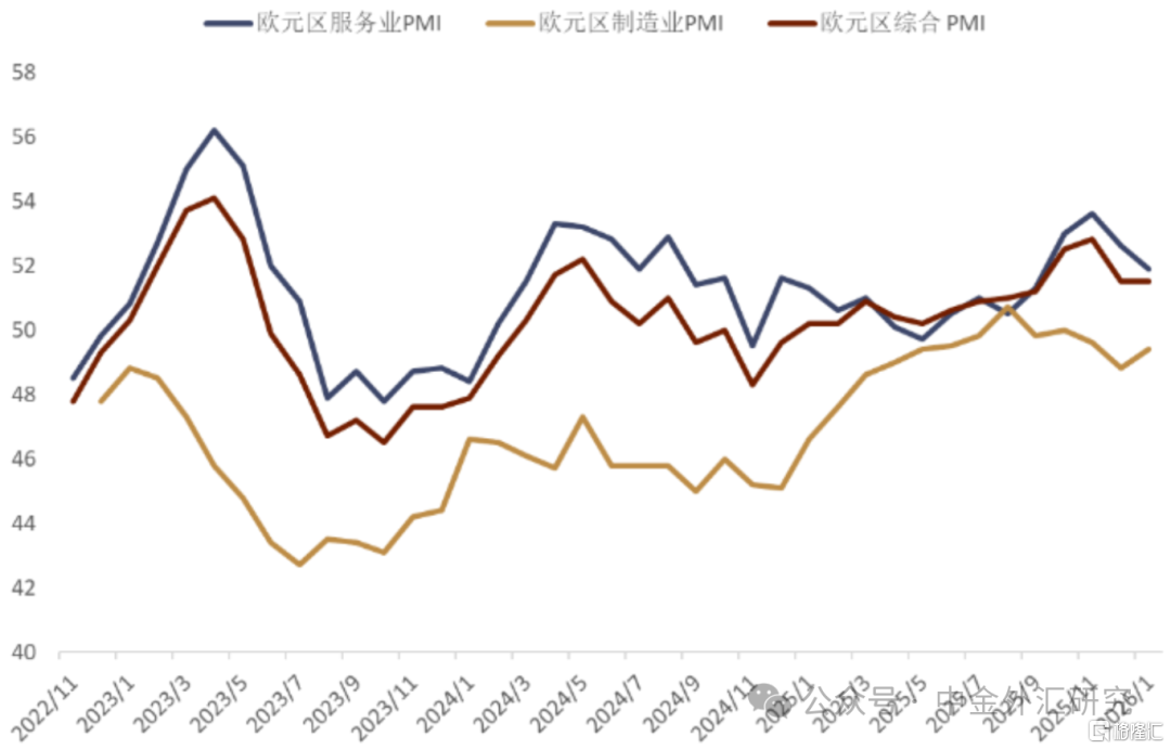 欧元区经济动能有所放缓 以PMI数据为代表的欧元区经济数据在1月自高位有所回落。欧元区1月综合PMI初值维持在51.5,虽然连续第二个月高于50这一荣枯线,但低于市场预期的51.9。服务业PMI初值降至51.9,低于预期及前值;制造业PMI初值虽小幅上升至49.4,但依旧处于收缩区间,这也反映出工业部门持续承压(图表17)。欧元区两大核心经济体在1月呈现明显分化,德国经济复苏动能进一步增强,而法国则再次陷入收缩。德国1月综合PMI升至52.5,高于市场预期及前值,并且连续第二个月站稳在扩张区间。而制造业PMI虽仍在荣枯线以下,但收缩幅度已较上月明显收窄;服务业则延续复苏态势支撑了德国整体经济表现的回暖:1月服务业PMI录得53.3,好于预期和前值。相比之下,法国经济再度承压:1月综合PMI回落至48.6,自去年10月以来首次跌破荣枯线。尽管其制造业PMI上升至51,进而创下了近四年的新高,但服务业活动急剧放缓至47.9,成为拖累经济整体表现的主要因素。在此背景下,欧元区花旗宏观经济意外指数在1月有所回落(图表18)。