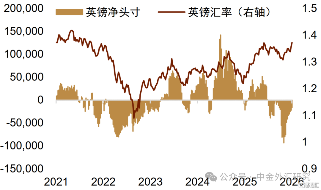 1月冲高回落 欧元区经济数据在1月相对维持了稳定,但边际增长动能有所放缓。而在欧元区通胀整体趋于稳定的背景下,市场对欧央行的降息预期继续维持稳定。但受到格陵兰地缘政治影响,欧元一度在1月走出过山车行情。在此背景下,欧元一度在美元整体走弱背景下上行至1.20附近,随后随着美元的整体反弹再次回落至去年9月以来的震荡区间内部,截至1月31日收盘,欧元/美元收涨1.3%左右,在G10货币中排名靠后,表现仅仅好于加元。