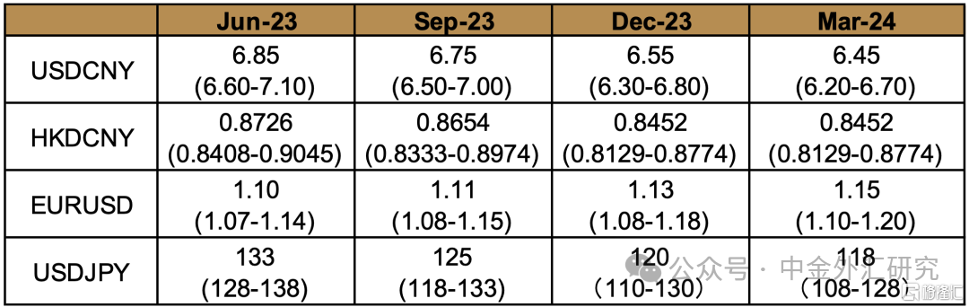 图表1:汇率预测表 (上段为中枢、下段为区间)