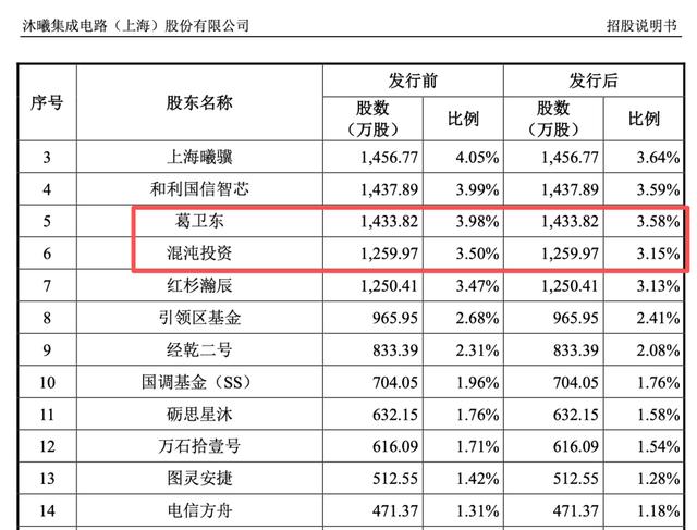 ①顶级私募大佬葛卫东持有沐曦股份发行后3.58%股份,他控制的混沌投资也持有3.15%,合计持股比例6.73%。